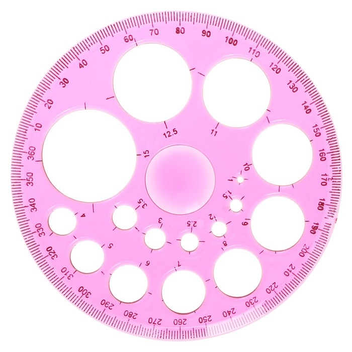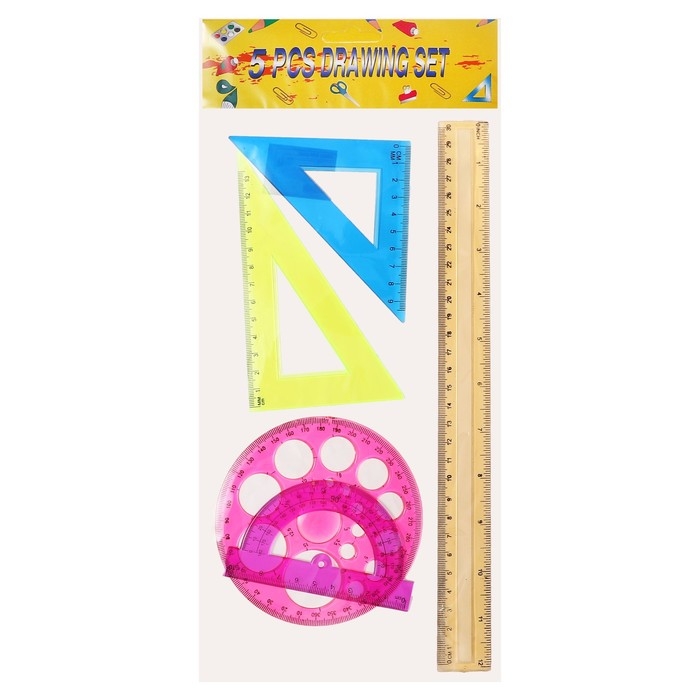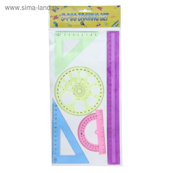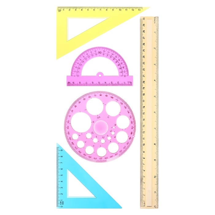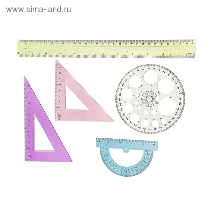 В комплекте: линейка 30 см, 2 треугольника, транспортир, трафарет окружности.