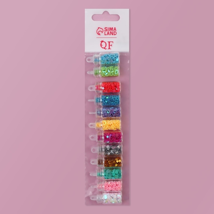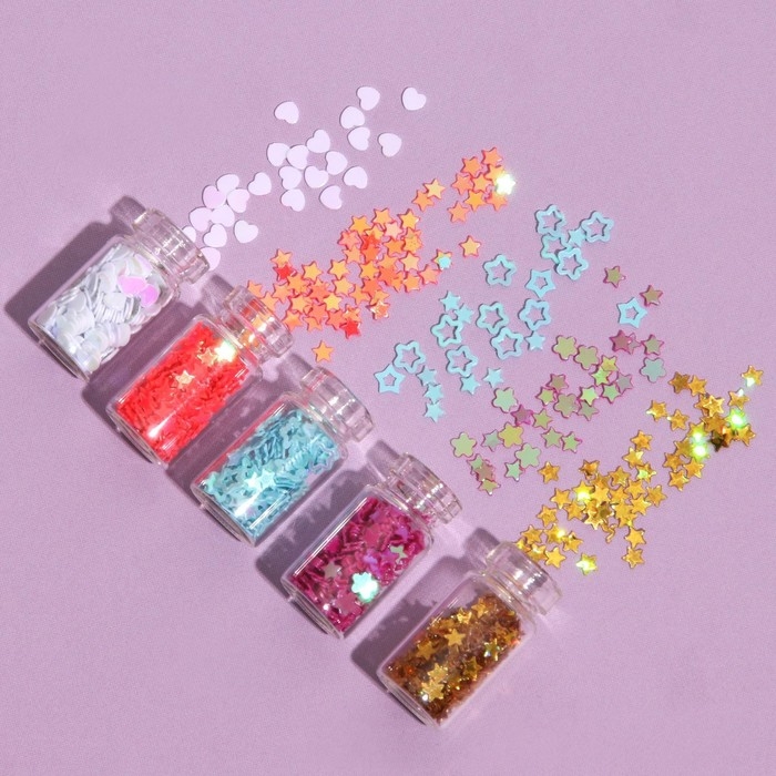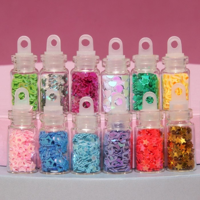 Пайетки для декора ногтей «Звёздочки, сердечки», 12 бутылочек, разноцветные