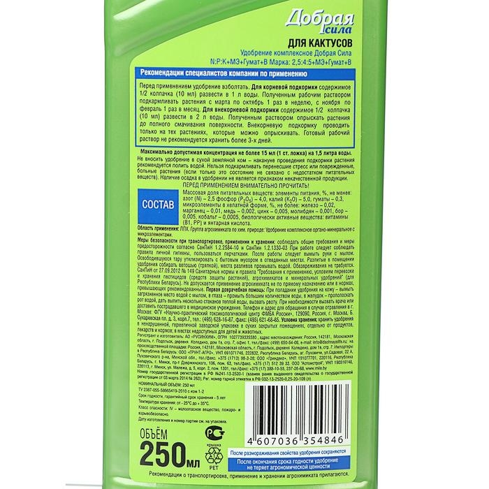 Удобрение "Добрая Сила", для кактусов и суккулентов, флакон, 250 мл
