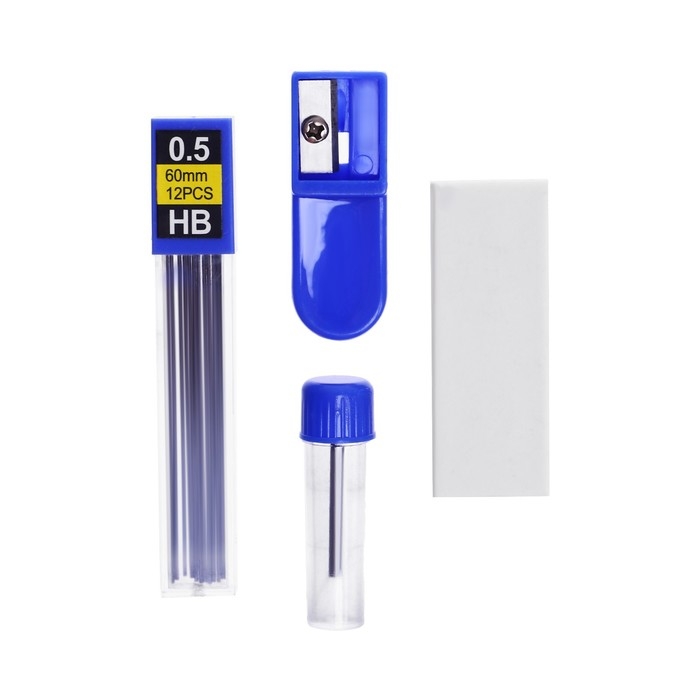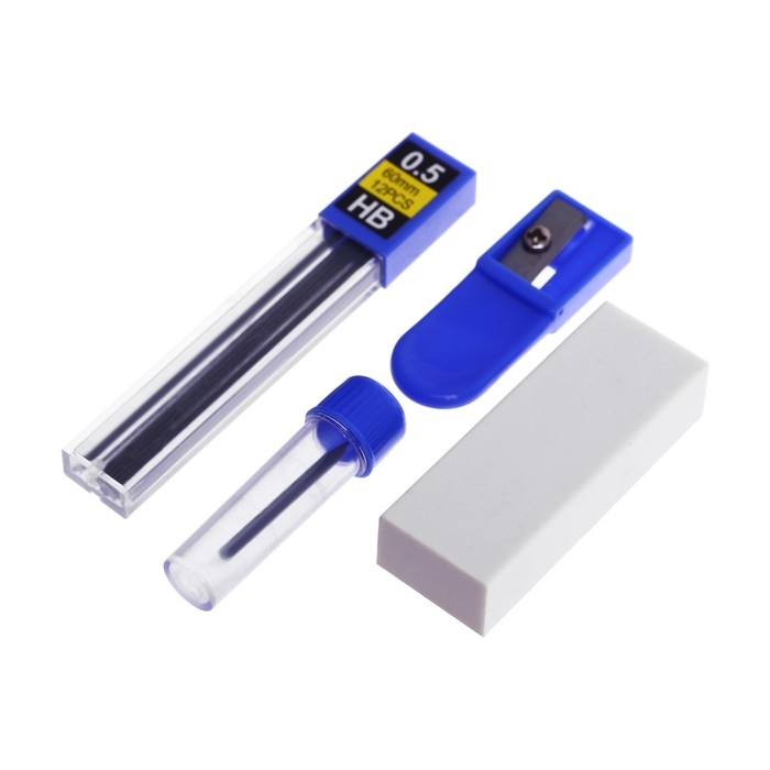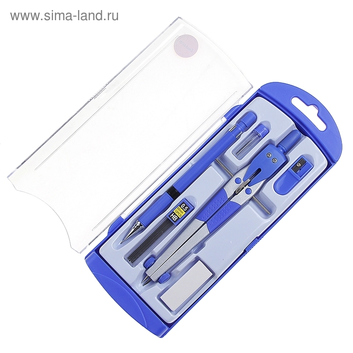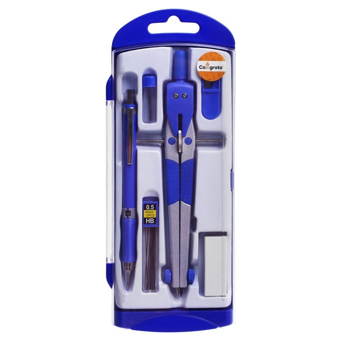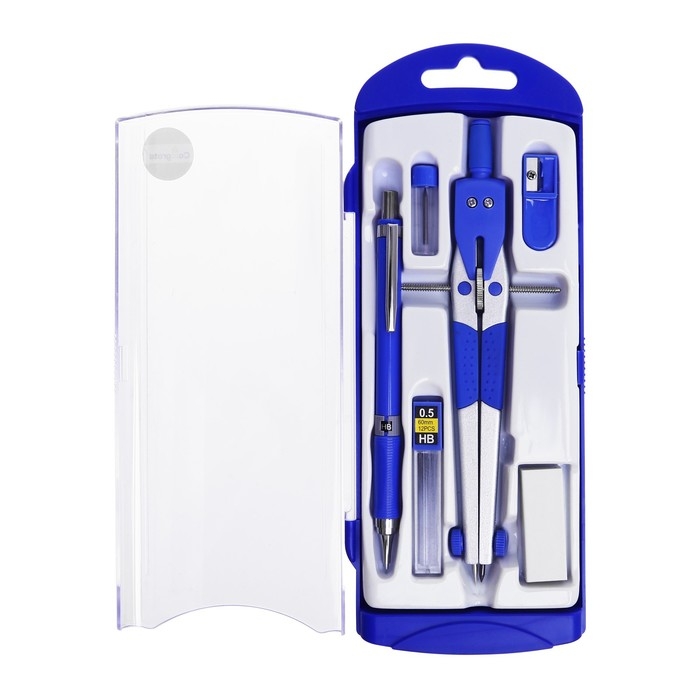 Готовальня, 6 предметов (циркуль, точилка, грифель, ластик, карандаш механический 0,5 мм, грифель НВ 0,5 мм) в пластиковом пенале