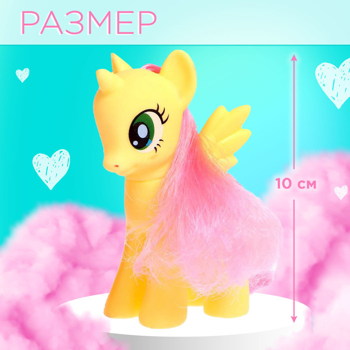 Кукле-малышке с длинными волосами ребёнок сделает причёску. В набор входит весёлый поняшка размером 6 × 3 × 10 см. Высота куколки — 17 см.