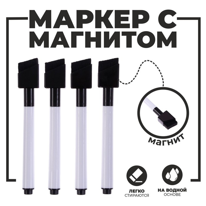 Маркеры на водной основе со стиралкой и магнитом, набор — 4 шт., цвет чёрный