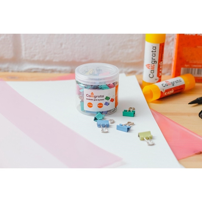 Набор зажимов для бумаг Calligrata, 4 цвета, 15 мм, 60 шт., в пластиковой тубе, МИКС