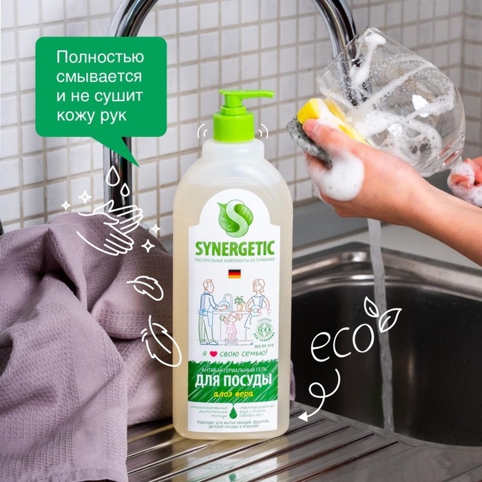 Биоразлагаемый концентрированный гель для посуды с антибактериальным эффектом SYNERGETIC - это экологичное, безопасное и эффективное средство для мытья всех видов посуды, в том числе детской, кухонного инвентаря и детских игрушек от любых видов загрязнений. Он не оставляет следов на посуде.