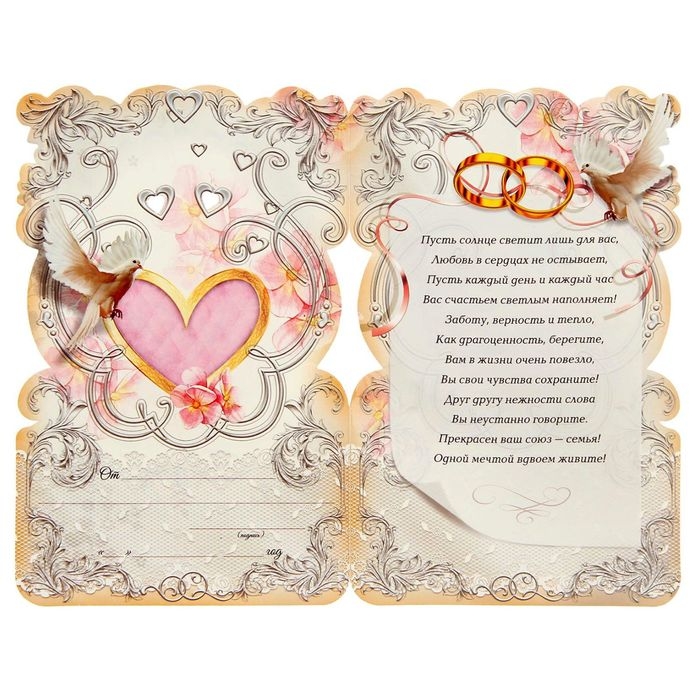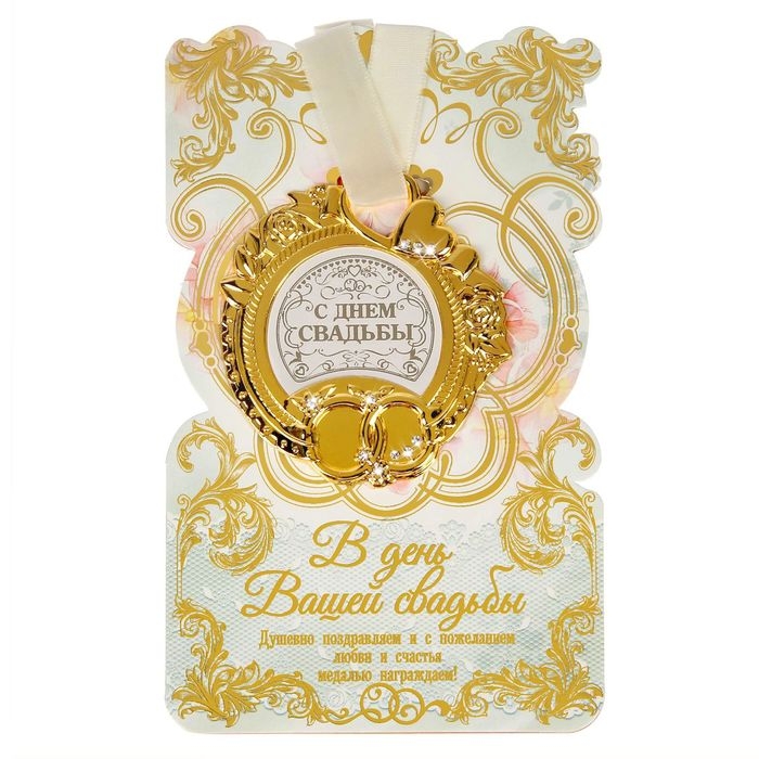 У ваших близких, друзей или родных намечается свадьба? Этот прекрасный сувенир поможет сделать поздравление ещё более душевным и запоминающимся. Награда эксклюзивной формы изготовлена из металла под золото и украшена великолепными сияющими стразами. Она преподносится на нежной оригинальной резной открытке с золотым тиснением. Внутри вы найдёте красивые искренние поздравления, написанные специально по случаю этого торжественного и важного дня!