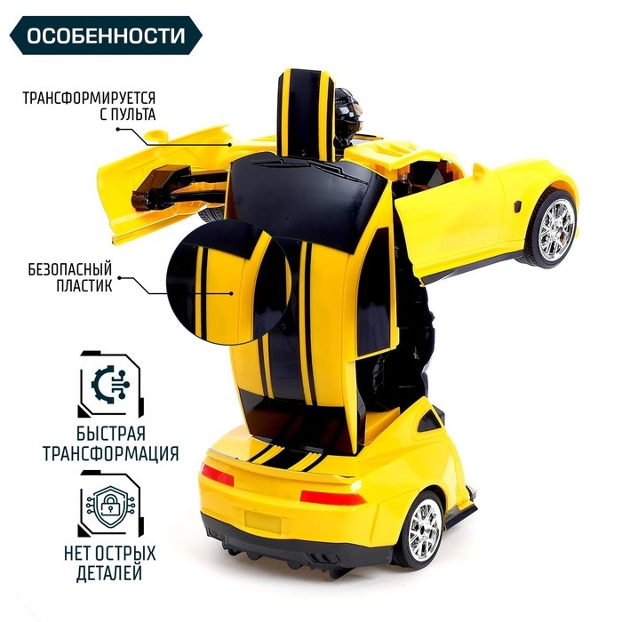 Дети сами выберут роль, которую будет исполнять герой. По желанию ребёнка трансформер приобретает форму спорткара и возвращается в исходное положение. Техника перевоплощается по сигналу с пульта. Подчиняясь командам, машина также ездит вперёд, назад, поворачивает вправо и влево.