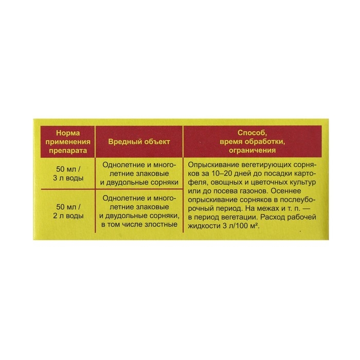 Для уничтожения однолетних и многолетних злаковых и двудольных сорняков, в том числе злостных. Применяется при опрыскивании вегетирующих сорняков до посадки картофеля, овощных и цветочных культур или до посева газонов, при опрыскивании сорняков в послеуборочный период, на межах и т. п. — в период вегетации.
