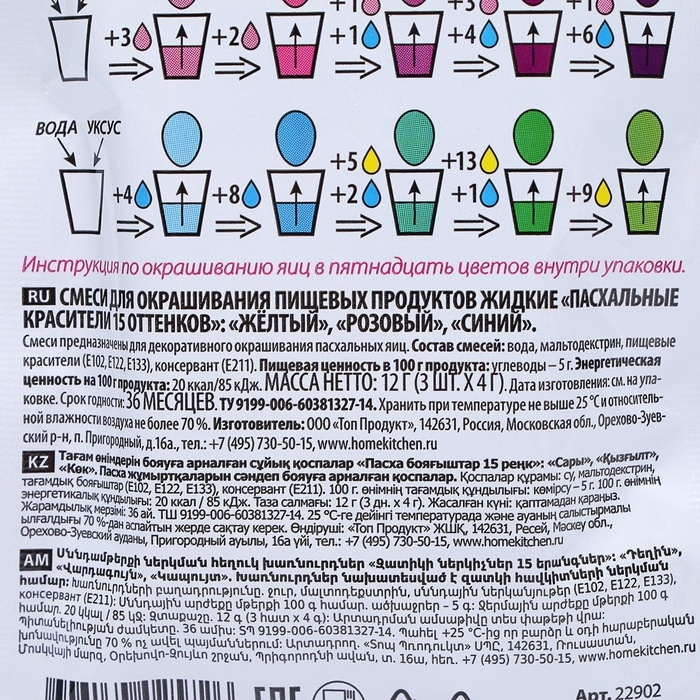 Красители пищевые жидкие — это отличный вариант для кулинаров и любителей творчества, которые ищут возможность добавить яркие акценты в свои кулинарные шедевры! Этот набор включает в себя 15 насыщенных оттенков, созданных на основе трех основных цветов, что позволяет вам получить множество количество вариаций и комбинировать цвета для достижения желаемого результата.