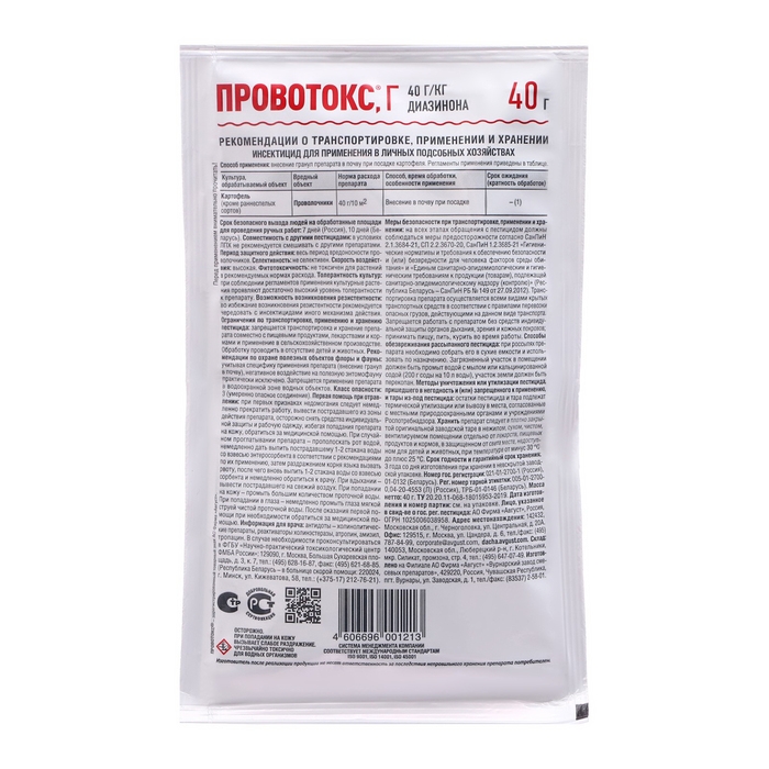 Способ применения: препарат раскладывается в лунки (на расстоянии 3-5 см от клубней) во время высадки картофеля. Раскладку препарата осуществлять утром (до 10:00) или вечером (после 18:00) в безветренную погоду при температуре не более 25ºС.