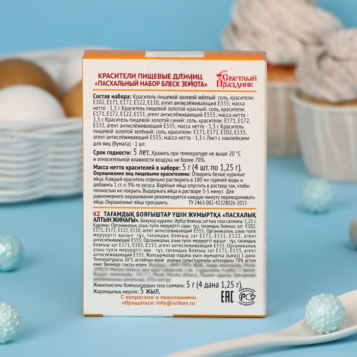 Краситель пищевой золотой жёлтый: соль, красители: Е102, Е171, Е172, Е122, Е110, агент антислёживающий Е555; масса нетто - 1,3 г. Краситель пищевой золотой красный: соль, красители: Е171, Е172, Е122, Е151, агент антислёживающий Е555; масса нетто - 1,3 г. Краситель пищевой золотой синий: соль, красители: Е171, Е172, Е133, агент антислёживающий Е555; масса нетто - 1,3 г. Краситель пищевой золотой зелёный: соль, красители: Е171, Е172, Е102, Е133, агент антислёживающий Е555; масса нетто - 1,3 г. Лист с наклейками для яиц (бумага) - 1 шт.