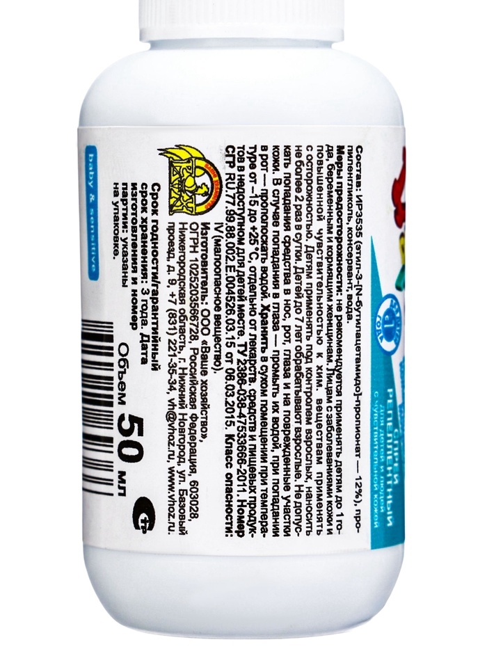 Содержит: ИР3535 (этил-3-[N-бутилацетамидо]-пропионат — 12%), пропиленгликоль, консервант, вода.