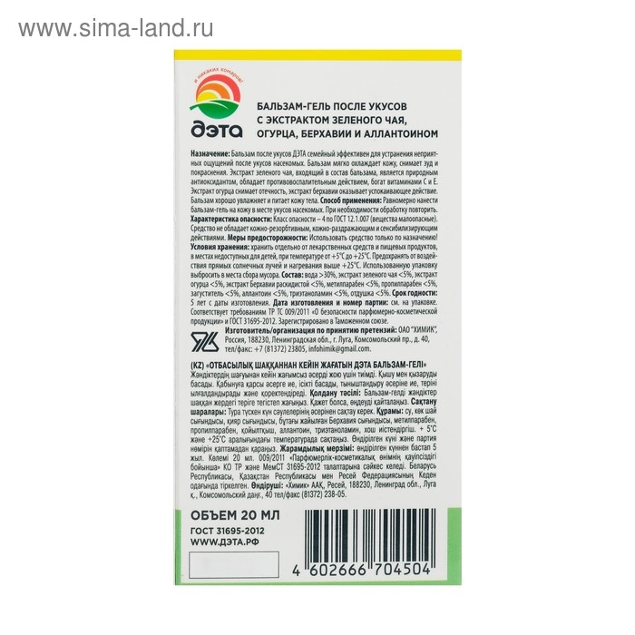 Способ примененияРавномерно нанести бальзам-гель на кожу в месте укусов насекомых.При необходимости обработку повторить.ПоказанияРекомендован для снятия дискомфорта после укусов насекомых.Составвода >30%, экстракт зеленого чая <5%, экстракт огурца <5%, экстракт Берхавии раскидистой <5%, метилпарабен <5%, пропилпарабен <5%, загуститель <5%, аллантоин <5%, триэтаноламин <5%, отдушка <5% (в т.ч. лимонен, линалоол, бензилсалицилат, цитраль).
