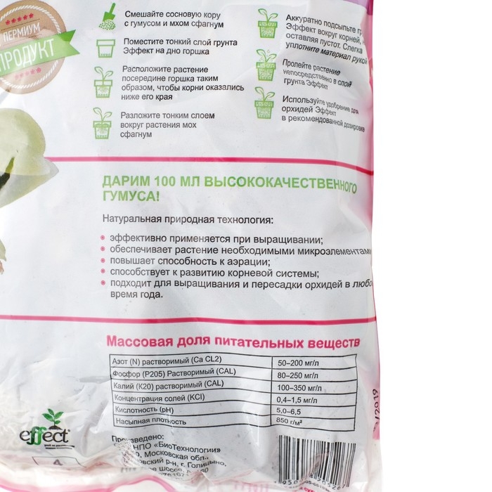 Состав: отборная калиброванная сосновая кора средней фракции, мох, гумус (в отдельном пакетике объёмом 100 мл).