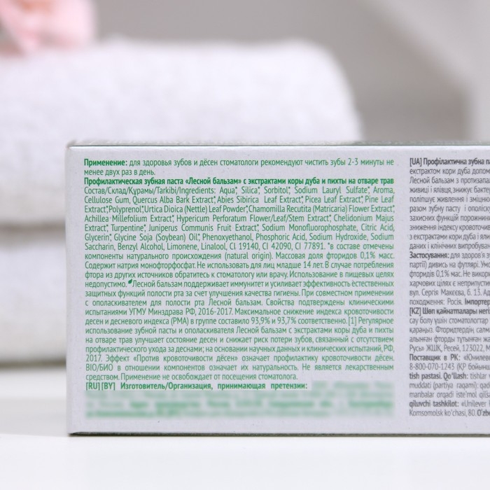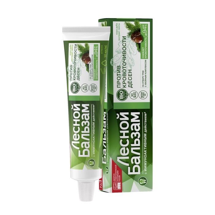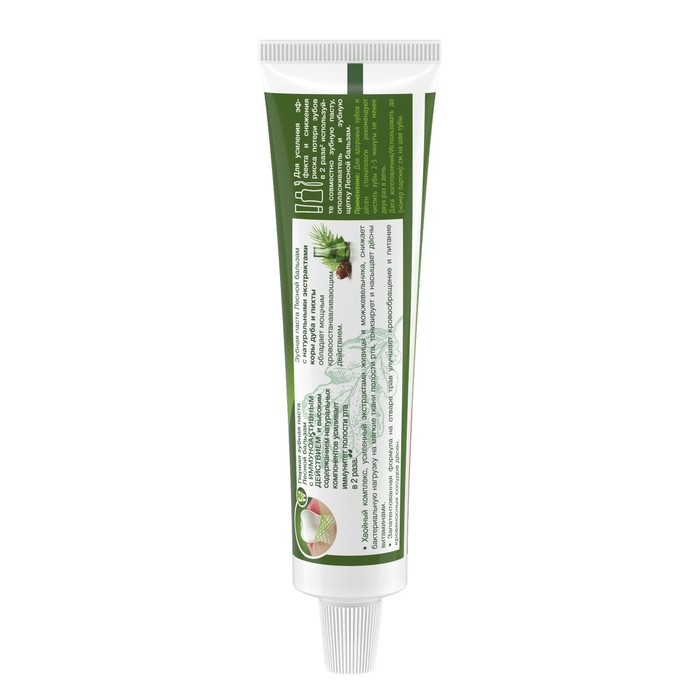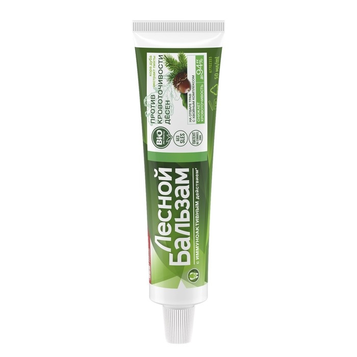 Состав: Aqua, Sorbitol, Silica, Sodium Lauryl Sulfate, Aroma, Cellulose Gum, Abies Sibirica Leaf Extract, Achillea Millefolium Extract, Chamomilla Recutita (Matricaria) Flower Extract, Chelidonium Majus Extract, Hypericum Perforatum Flower/Leaf/Stem Extract, Picea Leaf Extract, Polyprenol, Quercus Alba Bark Extract, Urtica Dioica (Nettle) Leaf Powder, Sodium Monofluorophosphate, Citric Acid, Glycerin, Phenoxyethanol, Sodium Benzoate, Sodium Chloride, Sodium Hydroxide, Sodium Saccharin, Sodium Sulfate, Eugenol, Limonene, CI 19140, CI 42090, CI 77891.