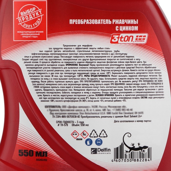 Преобразователь ржавчины с цинком 3ton ТН-579 предназначен для модификации продуктов коррозии и эффективной защиты любых стальных изделий (детали автомобилей, строительные металлоконструкции, трубы, нефтегазопроводы, железнодорожный транспорт, сельскохозяйственная техника и др.), эксплуатируемых в условиях агрессивной среды.