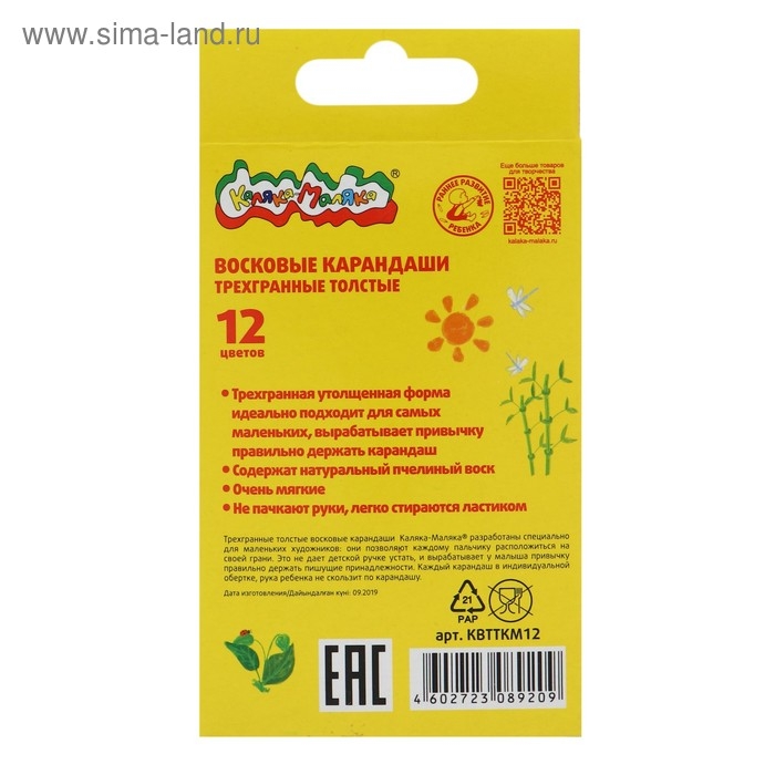 Мелки восковые 12 цветов, "Каляка-Маляка", трёхгранные