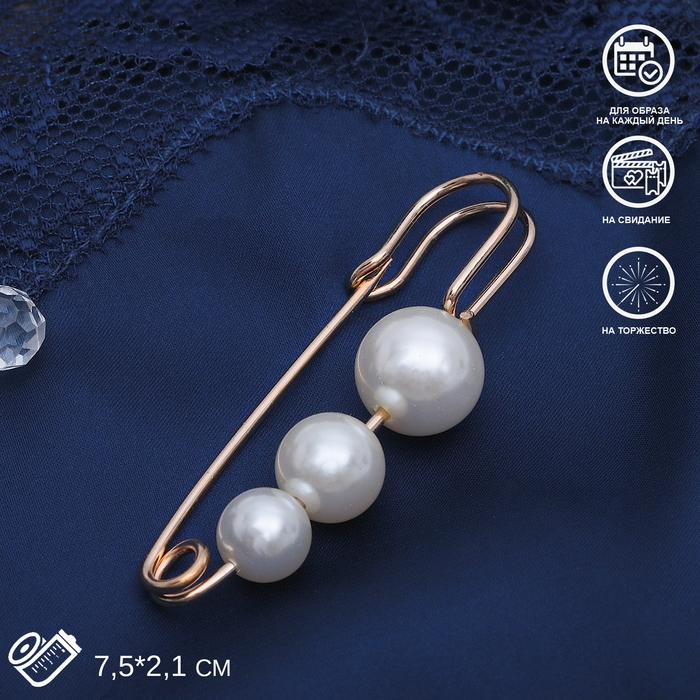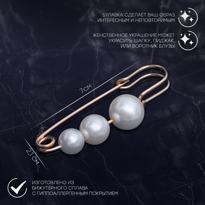 Данная булавка – настоящая находка для модниц, предпочитающих нетривиальные аксессуары. Брошь-булавка станет не только оригинальным дополнением вашего наряда, но и позволит без труда приколоть при необходимости палантин или шейный платок. Используйте её в качестве украшения шляпки, рубашки или галстука. Булавка «Жемчужинки три», 7 см, цвет белый в золоте внесёт особую нотку изящности в ваш образ.