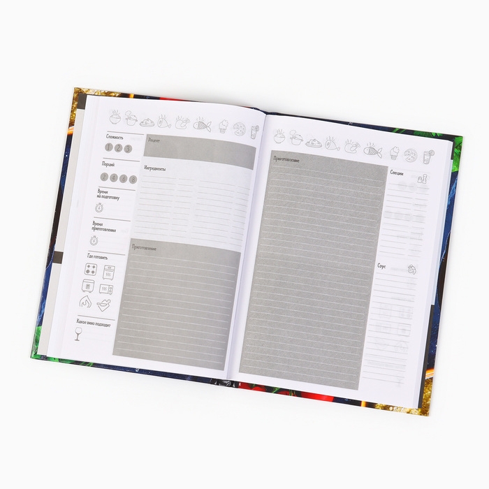 Ежедневник для записи рецептов - Отличный помощник на кухне, он всегда будет под рукой, в отличие от любых электронных аналогов. Записи позволят не забыть про удачный рецепт, который снова захотите повторить. Для удобства использования, вы можете отмечать сложность, время приготовления, где готовится и количество порций, для каждого рецепта, а так же записывать весь процесс приготовления. Благодаря твердой обложке он прослужит долгие годы. А универсальный формат, не займет много места на вашей кухне.