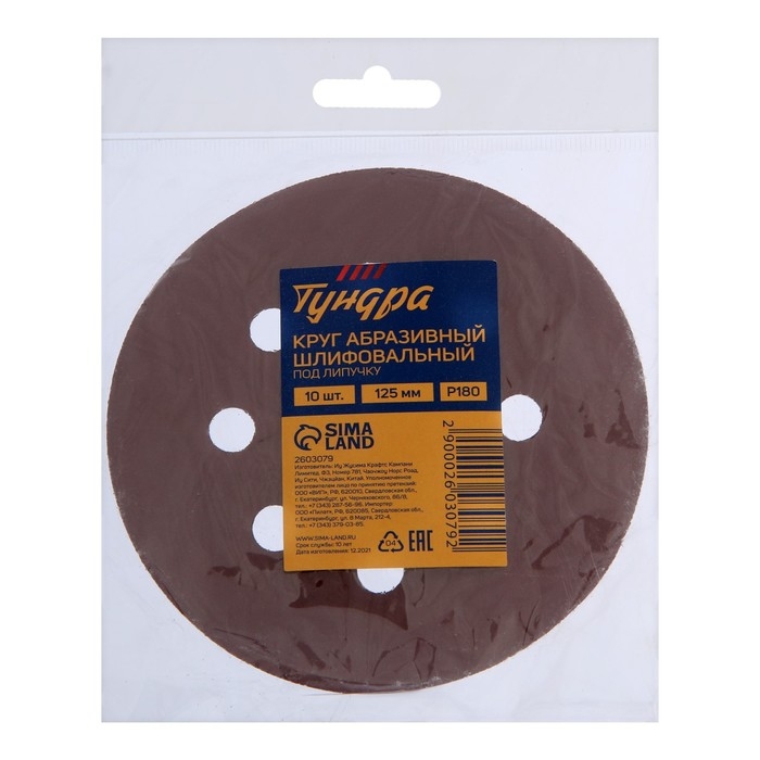 Круг абразивный шлифовальный под "липучку" ТУНДРА, перфорированный, 125 мм, Р180, 10 шт.