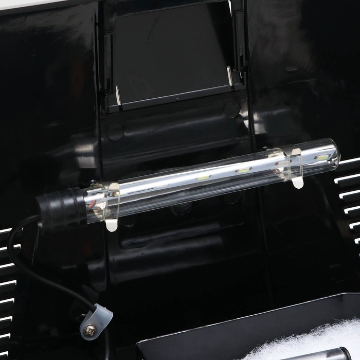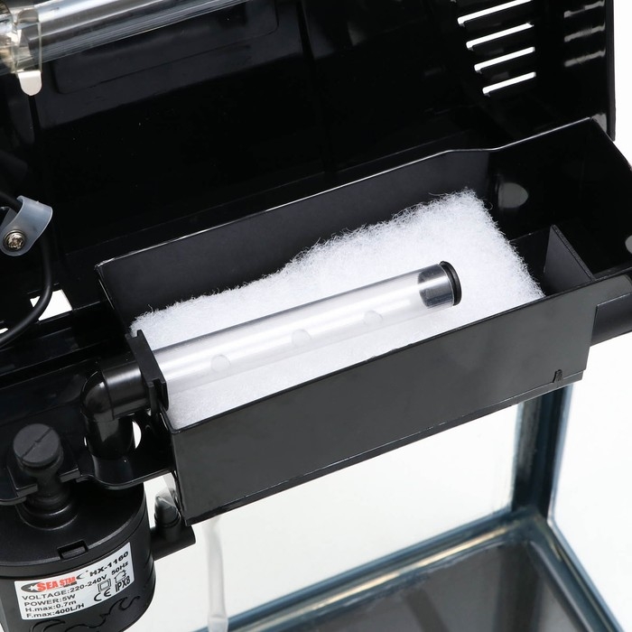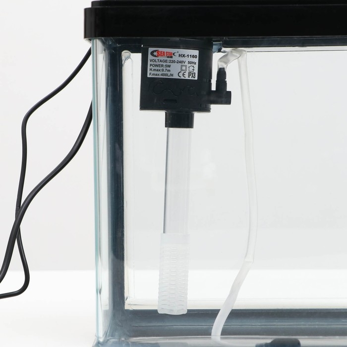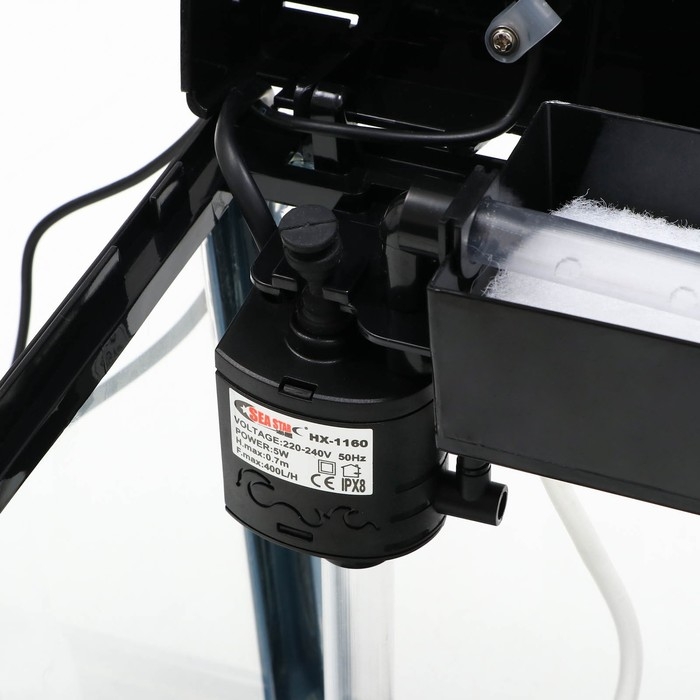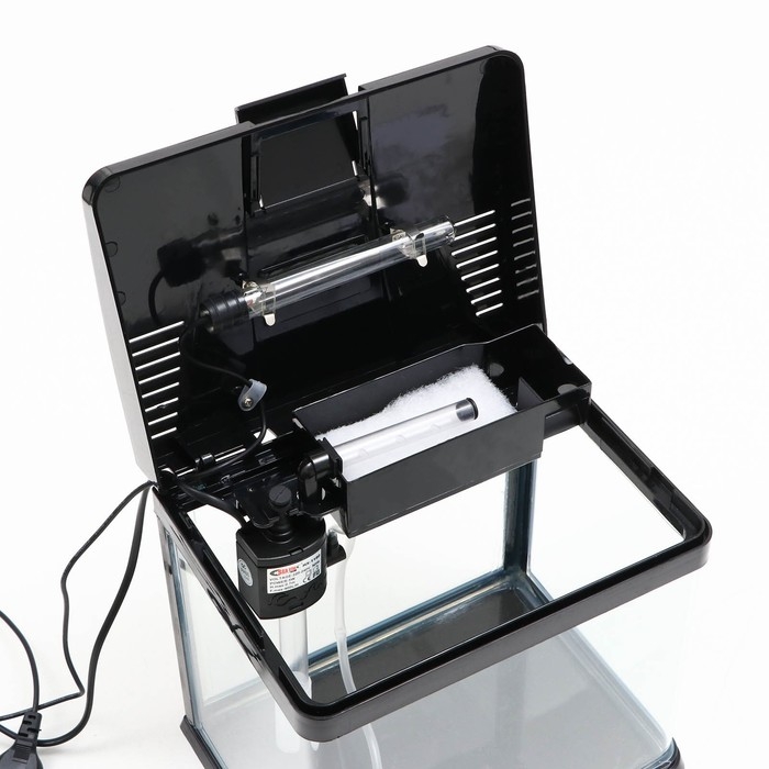Аквариум полностью готов к работе. Фильтр и светодиодная лампа встроены в крышку аквариума.