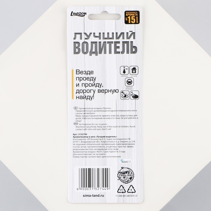 Ароматизатор в машину Luazon «Лучший водитель», аромат ваниль