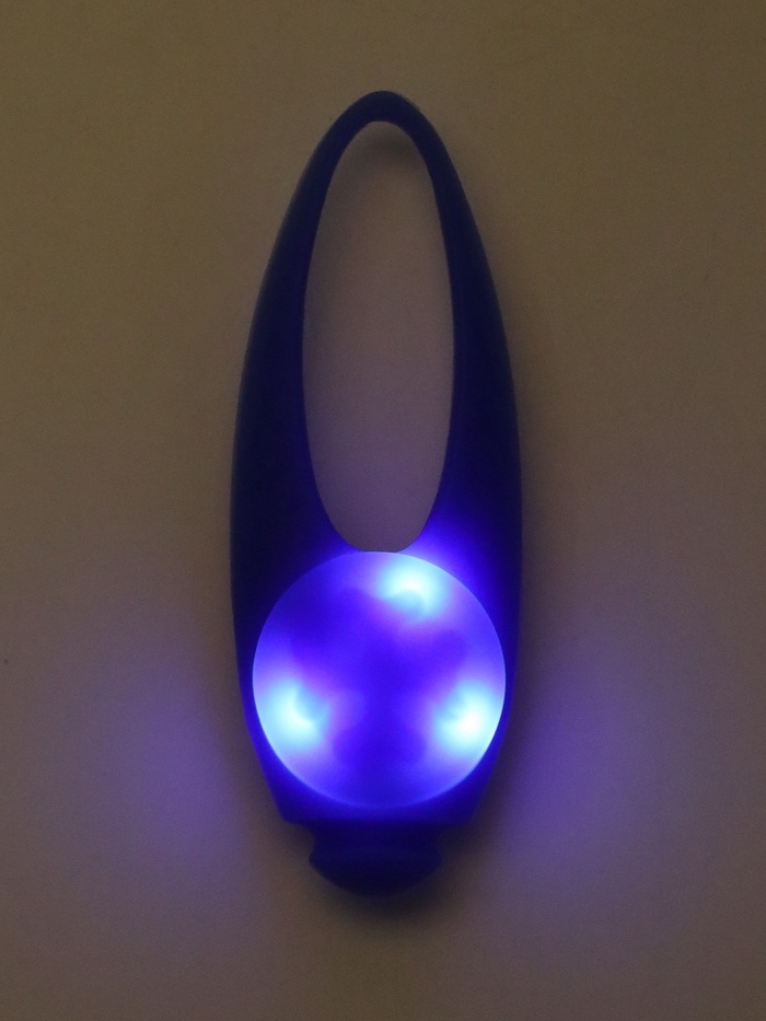 Маячок крепится на ошейник или поводок и оснащен тремя режимами свечения: постоянным, медленным и быстрым миганием.