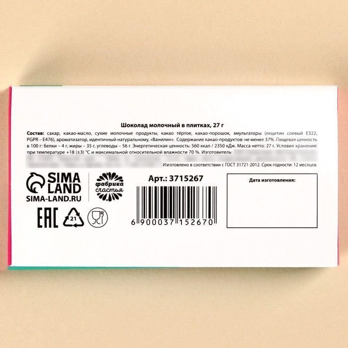 Состав: сухое цельное молоко, какое тёртое, масло какао, сухая молочная сыворотка, обезвоженный молочный жир, сахар, эмульгатор: соевый лецитин, ароматизатор, идентичный натуральному «Ванилин».