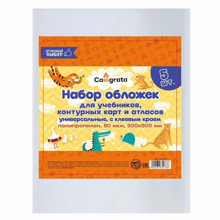 Набор обложек ПП 5 штук, 300 х 500 мм, 80 мкм, для учебников, тетрадей формата А4, контурных карт и атласов, с клеевым краем, универсальные