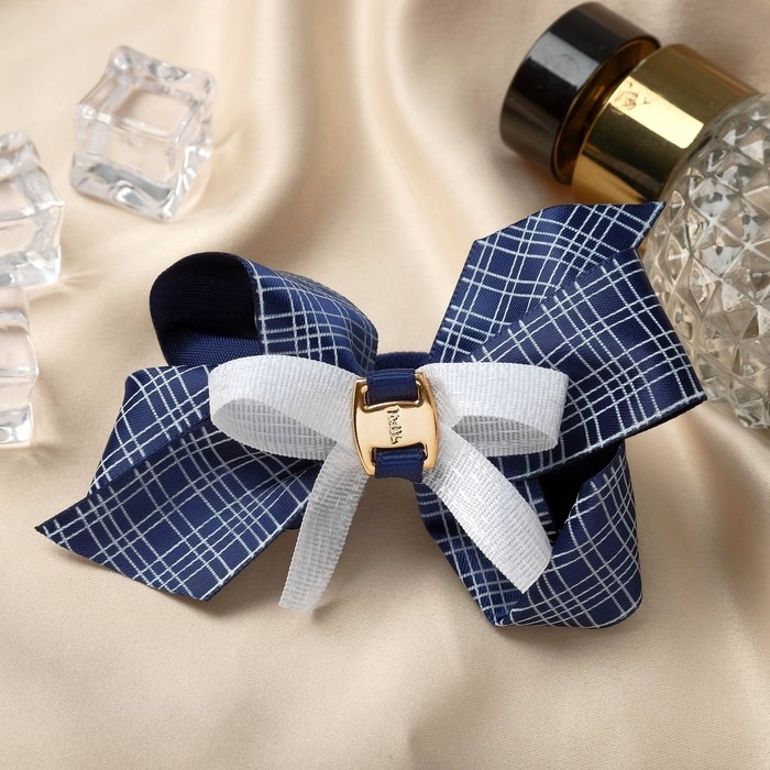 Резинка для волос "Школьница" бант двойная клетка, 9 см, бело-синий