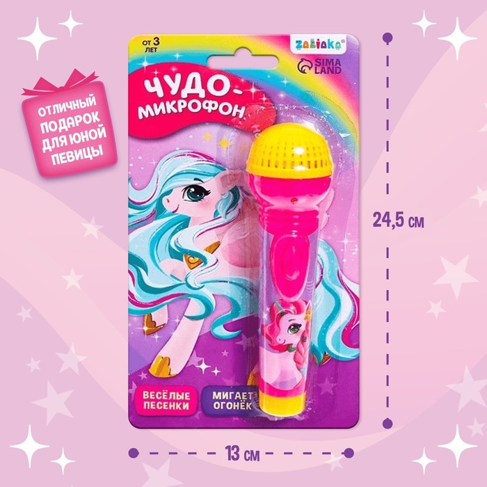 Ручной микрофон воспроизводит весёлые русские песенки. Также игрушка светится ярким огонёчком. Она очень удобная и компактная, поэтому можно устраивать концерты где угодно.