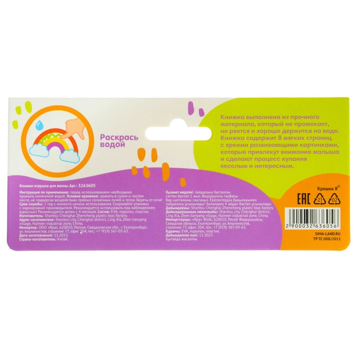 Красивая, яркая книжка предназначена для игры в ванной комнате, малышу будет очень весело разрисовывать книжку пальчиками, от контакта с водой книжка окрашивается разными цветами, после высыхания возвращается в первичное состояние. Изготовлена из безопасных материалов.