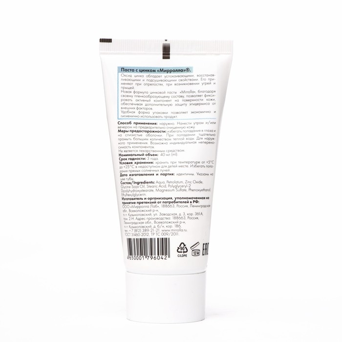 Паста цинковая «Мирролла», против угревой сыпи, воспалений и опрелостей, 40 мл