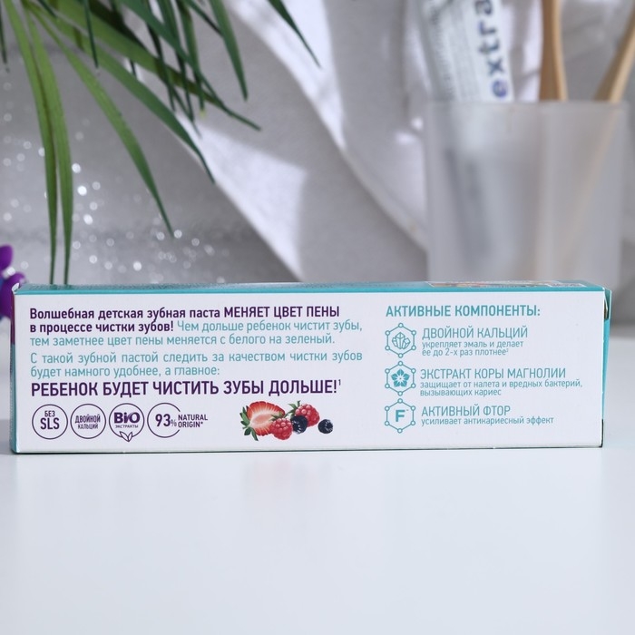 Благодаря специальной формуле, зубная паста меняет цвет пены, что позволяет следить за качеством чистки и является прекрасным развлечением для ребенка!