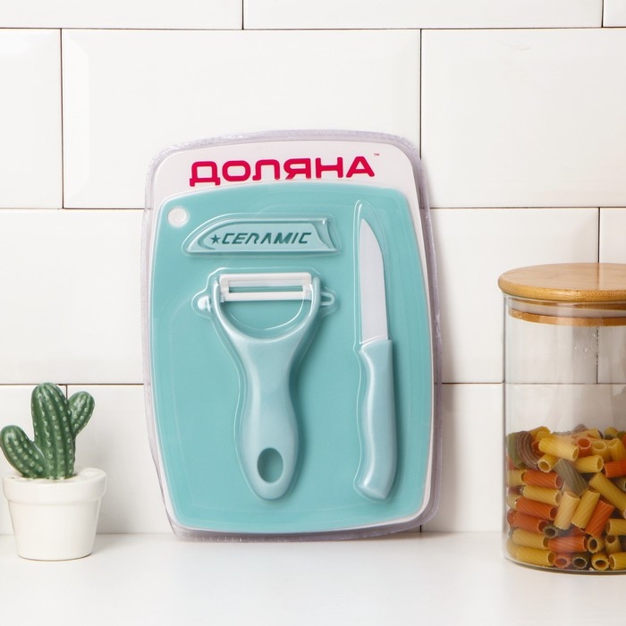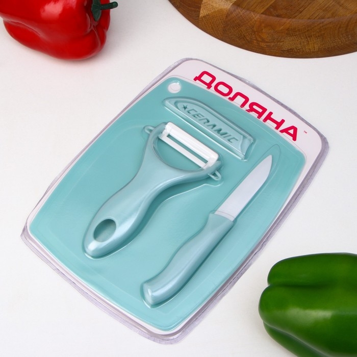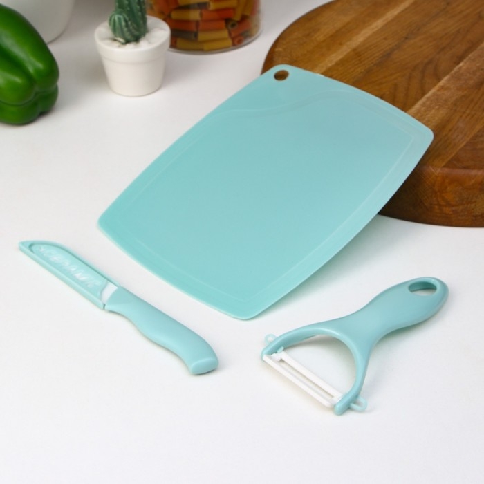 Набор кухонных принадлежностей Доляна «Керамик», 3 предмета: нож 16 см, овощечистка 12 см, доска 19,5×15,5 см, цвет голубой