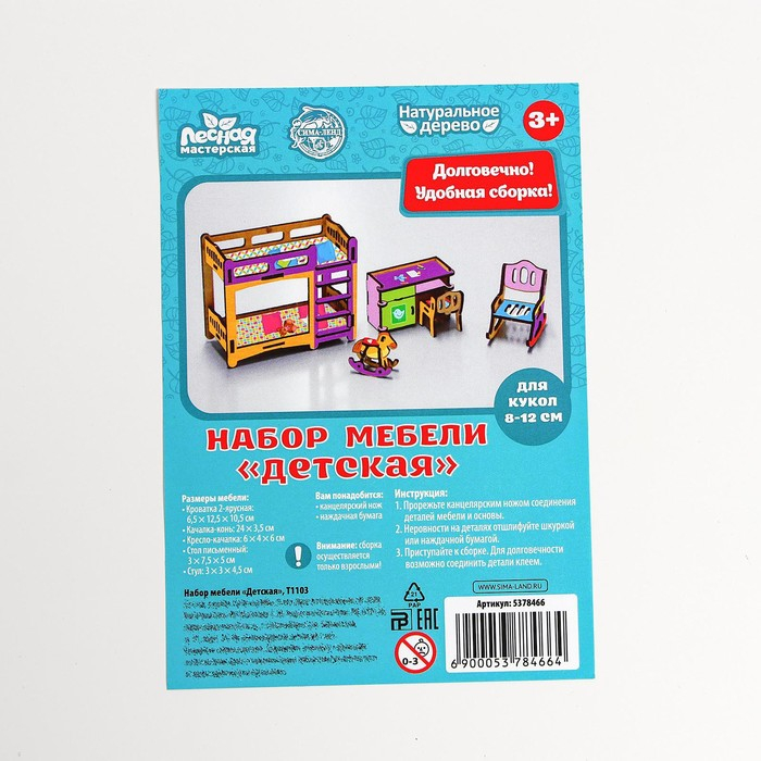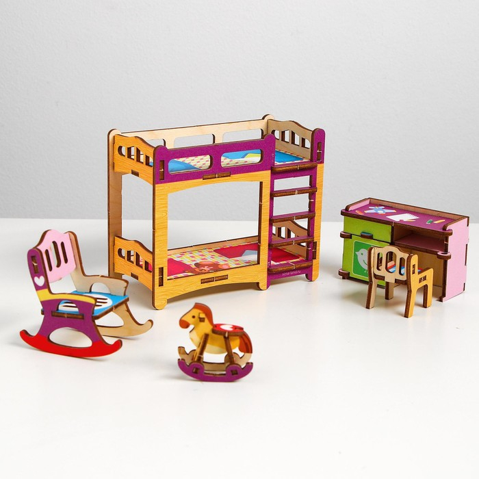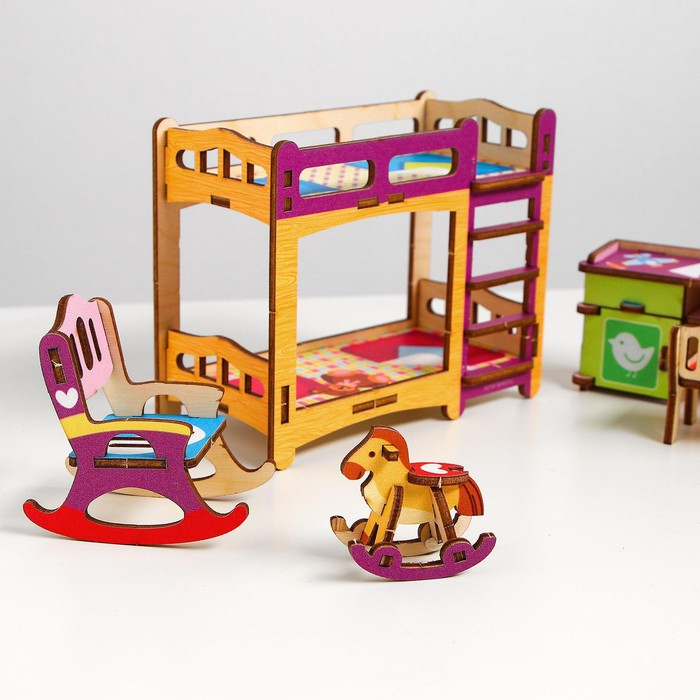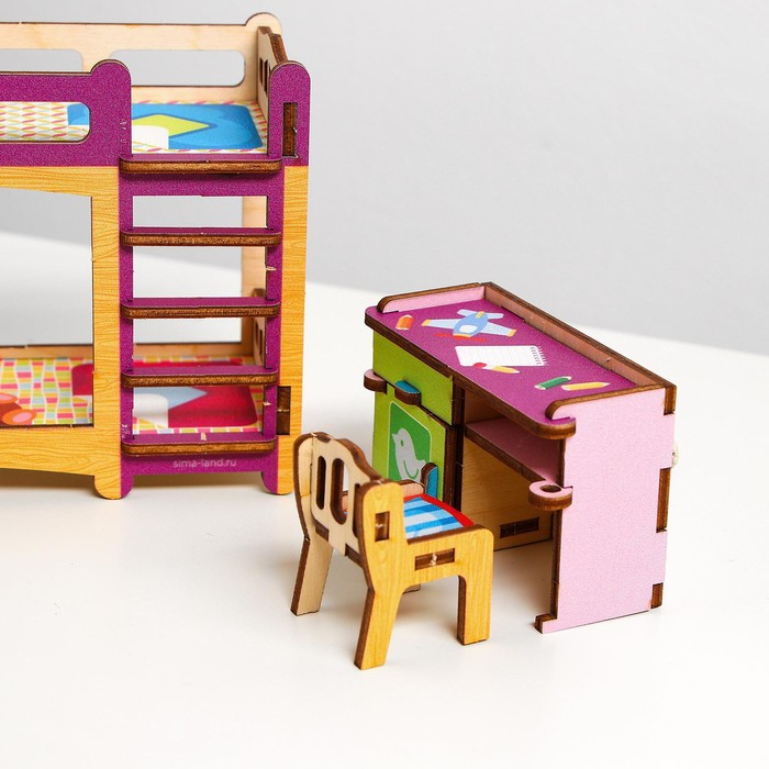 Создайте миниатюру настоящей комнаты из деревянных деталей. Предметы мебели сделаны из экологически натурального и безопасного материала. Изделия выглядят очень реалистично и идеально подойдут как для игр малыша, так и в качестве декора для детской.