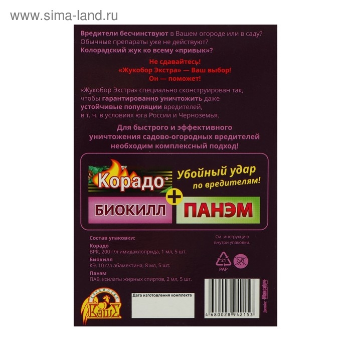 Ваше Хозяйство Экстра – эффективный инсектицид для борьбы с грызущими и сосущими насекомыми-вредителями сада и огорода в личных подсобных хозяйствах. Препарат специально сконструирован так, чтобы гарантировано уничтожить даже устойчивые популяции вредителей, в то числе в условиях юга России и Черноземья. 3 класс опасности.