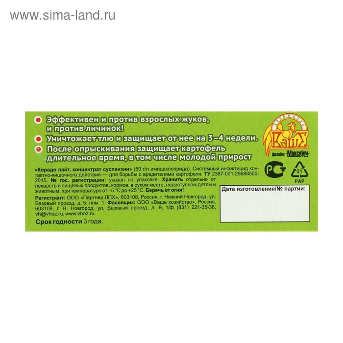 Корадо» гарантирует практически 100% гибель взрослых жуков и личинок всех возрастов, а также гибель вновь отрождающихся личинок и защищает картофель длительное время: в течение 3-4 недель после опрыскивания.