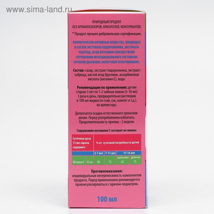 Продукт прошел добровольную сертификацию. Обладает общеукрепляющим и мягким отхаркивающим действием, улучшает функциональное состояние органов дыхания. Повышает сопротивляемость организма к простудным заболеваниям. Обладает приятным вкусом и цветом ягод брусники.