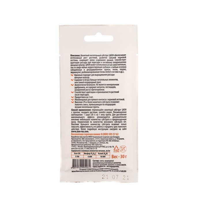 Субстрат ZION ионитный для выращивания овощей, питательная добавка для растений, 30 гр