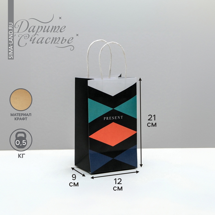 Пакет подарочный крафтовый, упаковка, «Present», 12 х 21 х 9 см
