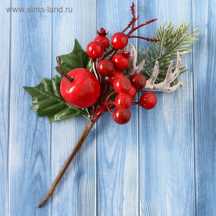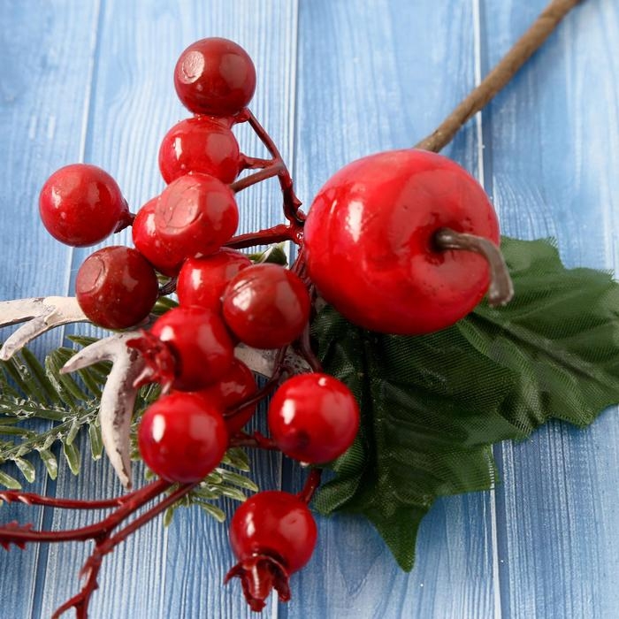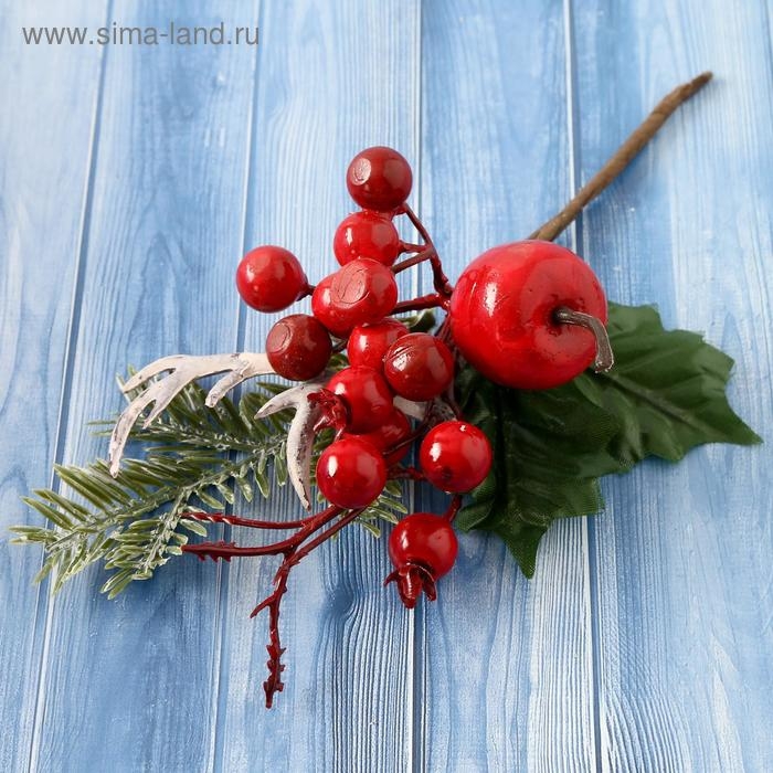 Новогодняя ветка декоративная «Зимнее волшебство. Очарование», пластик, красное яблоко, ягоды, хвоя, 20 см