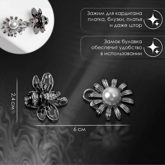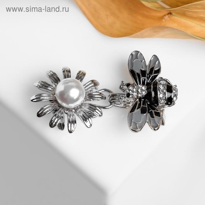 Зажим для кардигана «Пчела», пришивной, цвет чёрно-белый в серебре