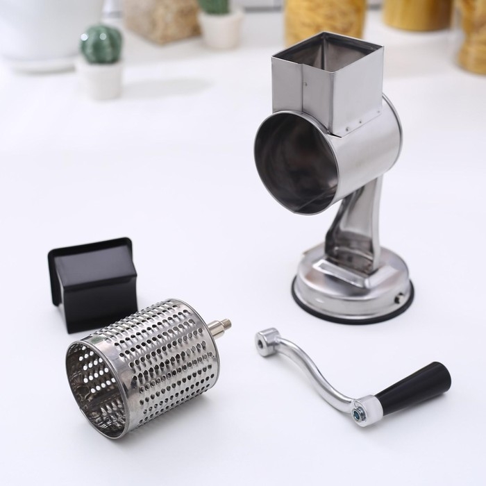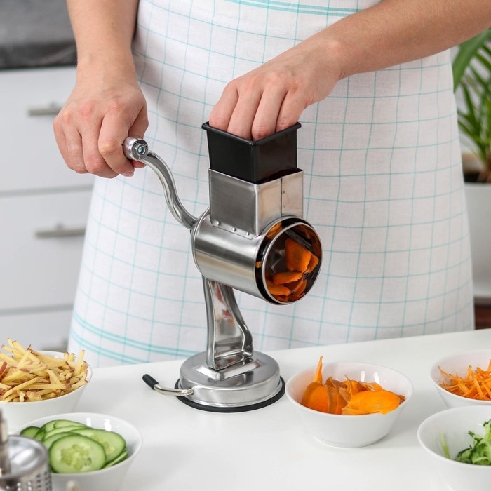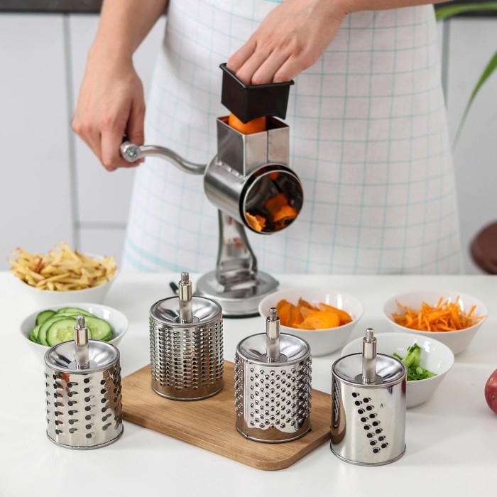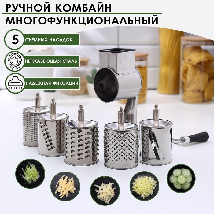 Многофункциональный ручной комбайн быстро нарежет продукты для самых разнообразных блюд. Прибор работает по принципу мясорубки — острые лезвия измельчают продукты, когда вы прокручиваете ручку.