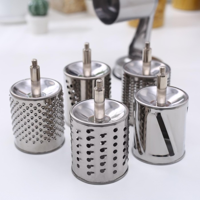 Благодаря широкому дозатору и 5 разным насадкам можно мелко натереть орехи, шоколад, сыр, порезать крупной соломкой или слайсами фрукты и овощи. Насадки легко снимаются и моются.