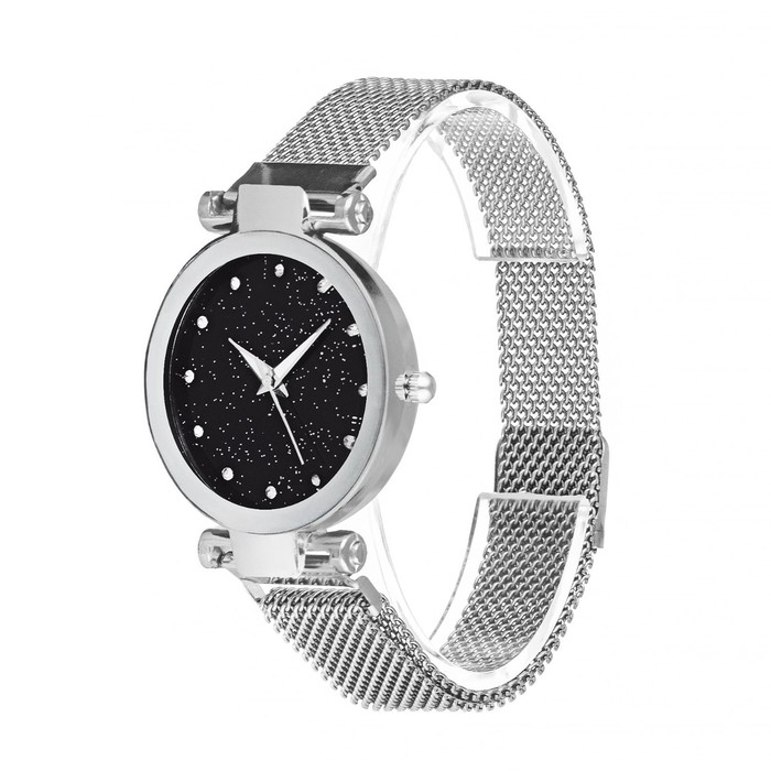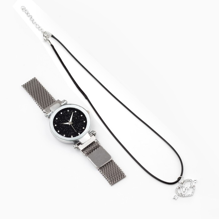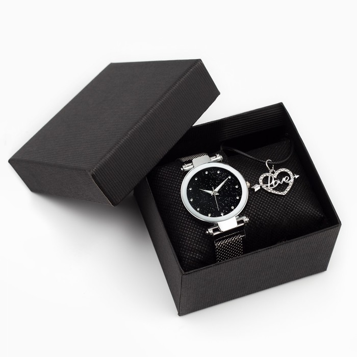 Подарочый набор включает в себя наручные часы и кулон в форме сердца. Циферблат изготовлен в цвете звездного неба, словно тясяча зездочек во времени освещают твой путь.