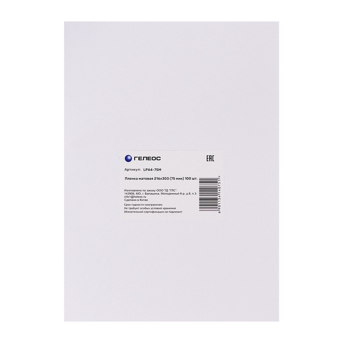 Пленка для ламинирования A4 216х303 мм, 75 мкм, 100 штук, матовые, Гелеос