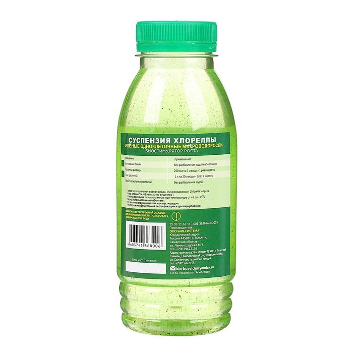 Суспензия хлореллы (зеленые одноклеточные микроводоросли) биостимулятор роста. Состав: культуральная водная среда, микроводоросли Chlorella Vulgaris. Класс опасности: 4 (неопасное вещество). Условия хранения: в темном месте при температуре от +5 до +25 градусов С. Перед использованием взболтать. Не является агрохимикатом или пестицидом. Не подлежит обязательной сертификации и декларированию.