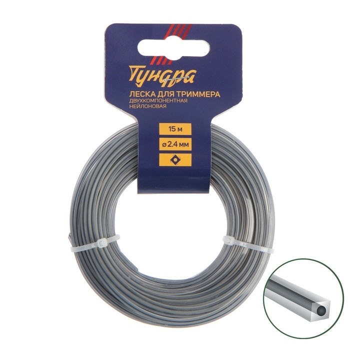Леска для триммера ТУНДРА, сечение квадрат с жилой, двухкомпонентная, d=2.4 мм, 15 м