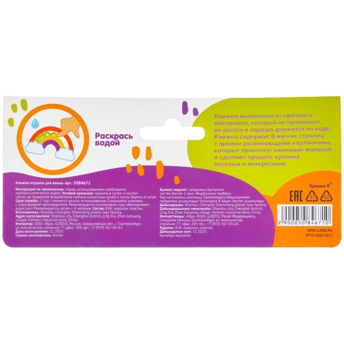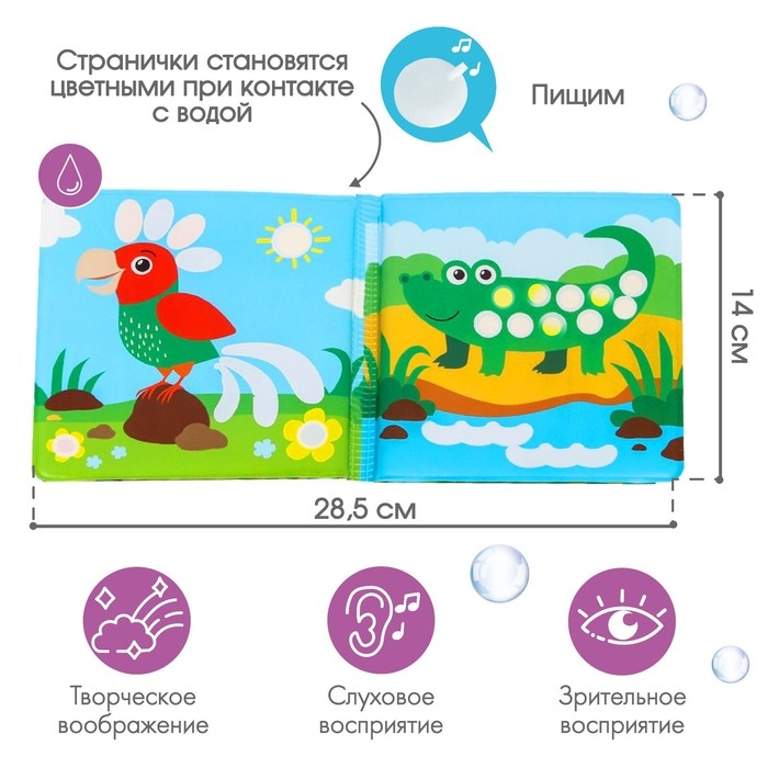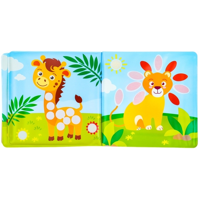 Красивая, яркая книжка предназначена для игры в ванной комнате, малышу будет очень весело разрисовывать книжку пальчиками, от контакта с водой книжка окрашивается разными цветами, после высыхания возвращается в первичное состояние. Изготовлена из безопасных материалов.