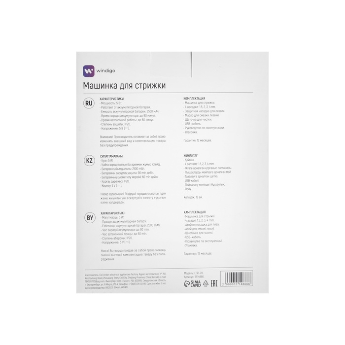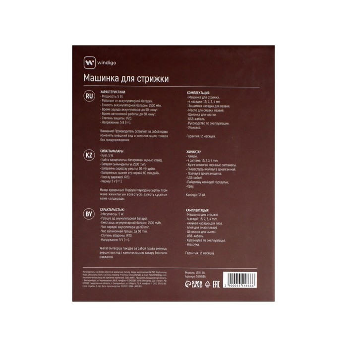 Машинка для стрижки Windigo LTRI-28, портативная, 2500 мАч, 1,5/2/3/4 мм, АКБ, "Барбер"